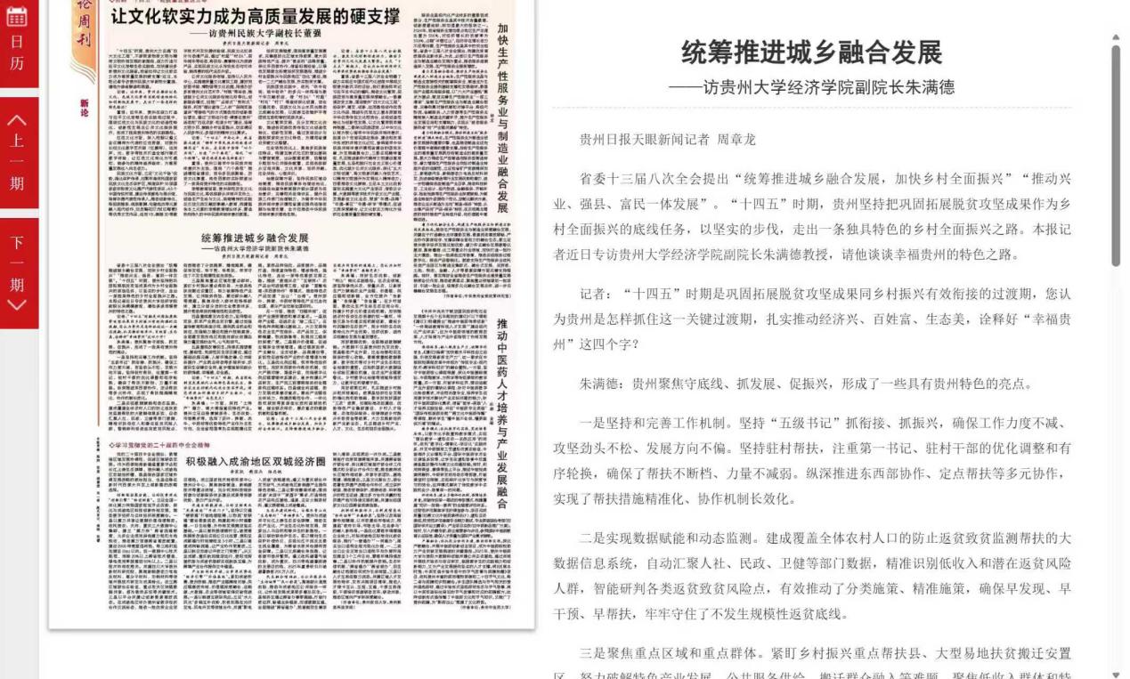 2025年11月26日,贵州日报就“十四五”时期贵州统筹城乡融合发展、推进乡村全面振兴相关问题,专访了贵州大学经济学院副院长朱满德教授。