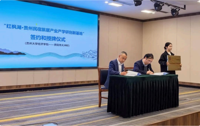 会上,贵州大学经济学院与贵阳市大冲村村民委员会正式签约,联合成立“ 红枫湖·贵州民宿旅居产业产学研创新基地”。项目团队成员全程参与了本次的学术讲座。