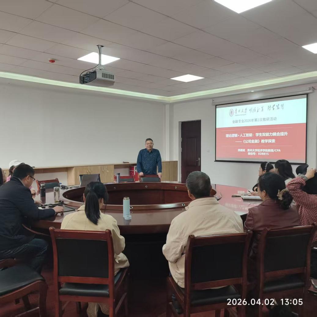 2026 年 4 月 2 日,贵州大学经济学院金融专业 2026 年第 2 次教研活动顺利举行。本次活动由熊德斌教授主讲,围绕“理论逻辑 + 人工智能:学生双能力耦合提升 ——《公司金融》教学探索”主题展开深度研讨,金融系全体教师参会,共同探讨人工智能时代金融类课程教学创新路径。熊德斌老师结合自身教学实践与前沿教育理念,从四大维度系统分享《公司金融》课程改革思路。他首先阐释了《公司金融》在金融人才培养方案中的核心地位与底层逻辑,明确课程以投资、融资、股利决策三大核心内容为支撑,紧扣企业价值创造与金融市场运行规律,是连接微观企业运营与宏观金融监管的关键课程。围绕 “理论逻辑 + 人工智能” 融合教学,熊老师重点解读了学生理论思维、AI 应用、价值判断三大能力协同提升路径,提出 AI 嵌入将引发教学关系从 “教师—学生二元” 向 “教师—人工智能—学生”三元变革,推动教师角色从知识传授者向学习引导者、人机协同组织者、成长赋能者转型。他以戈登模型估值、IPO 融资案例、餐馆投融资方案等为例,现场演示AI工具在公式计算、边界条件分析、资本市场实证、敏感性测试中的实操应用,展示“人机交互、思维对