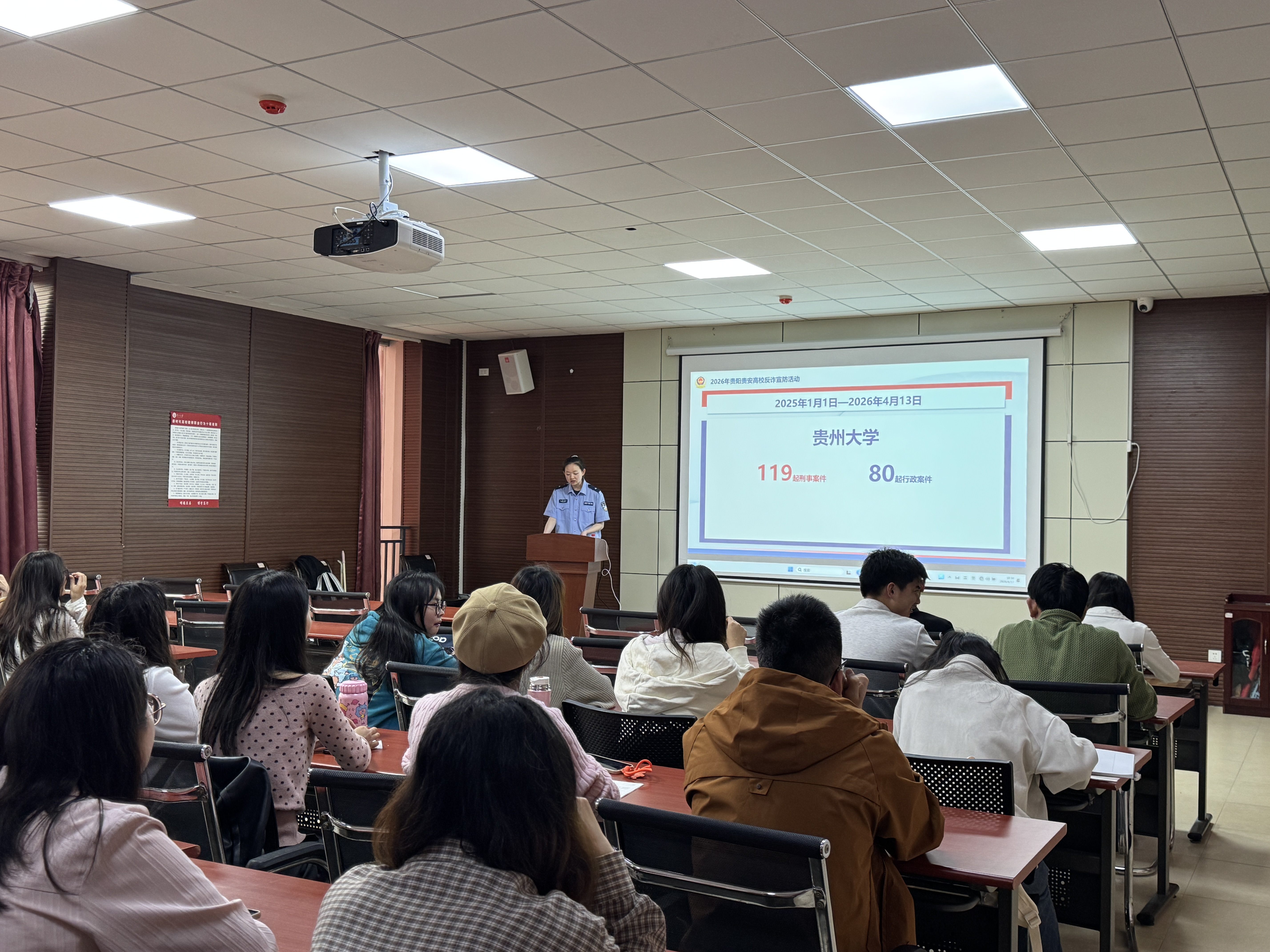 2026年4月17日,“百警进班,守护青春:2026年贵阳贵安高校反诈宣防活动”走进贵州大学经济学院。本次活动由贵阳市公安局联合花溪分局反诈中心、贵州大学主办,经济学院研究生按照专业、年级分时段参与活动。